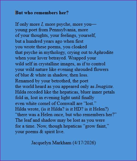 So, I selected a modern American poet I’ve long adored: Hilda Doolittle, known–if known at all–as H.D. Imagiste!
